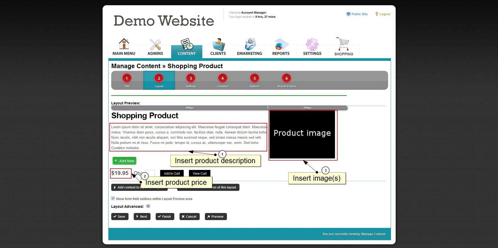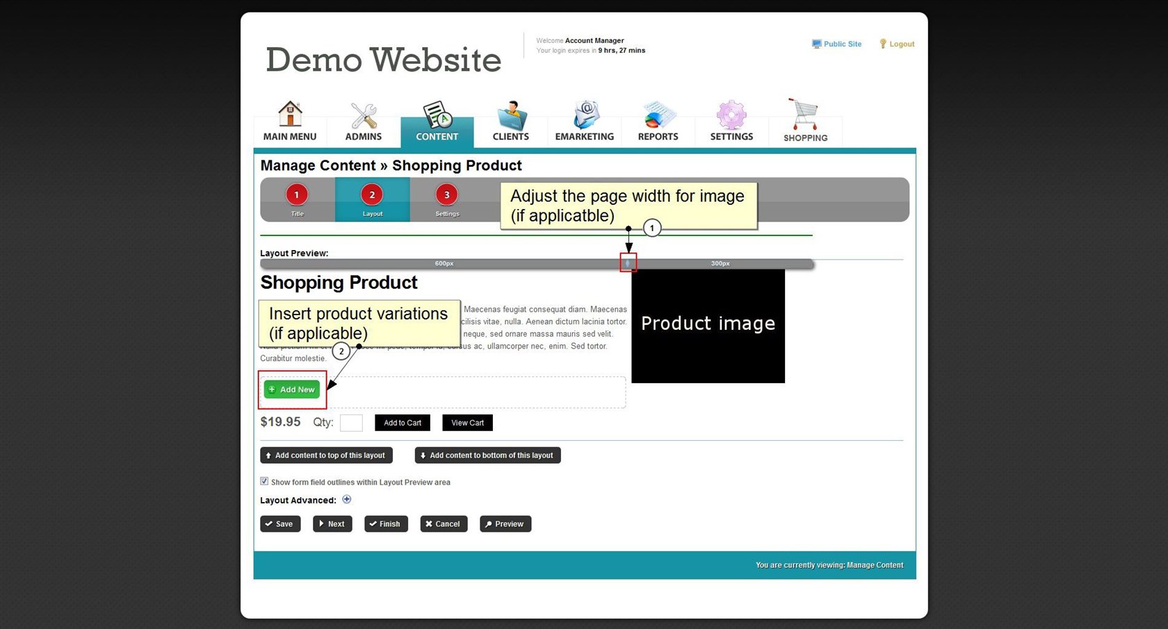 This guide will show you how to create a shopping product easily through the content management system. There are various layouts available for you to choose from.