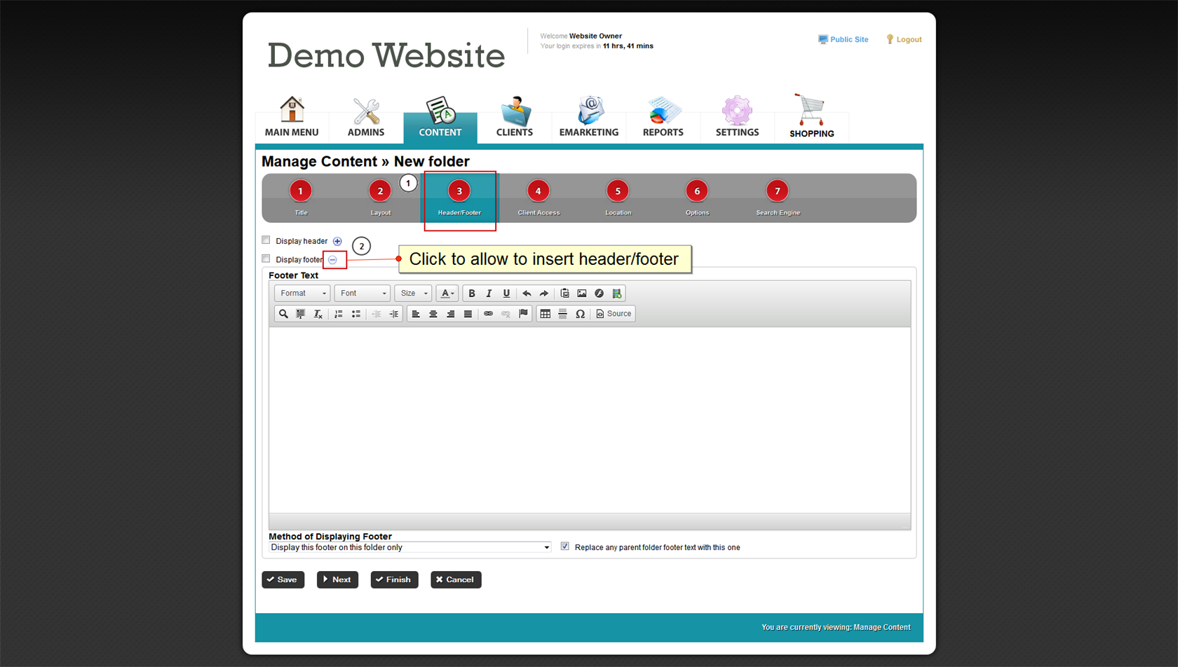 7. Click on the square next to Display header or Display footer