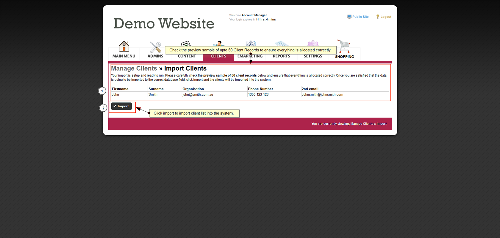 It is important to setup your Client Fields and Client Groups before importing a Client list into the website database. |