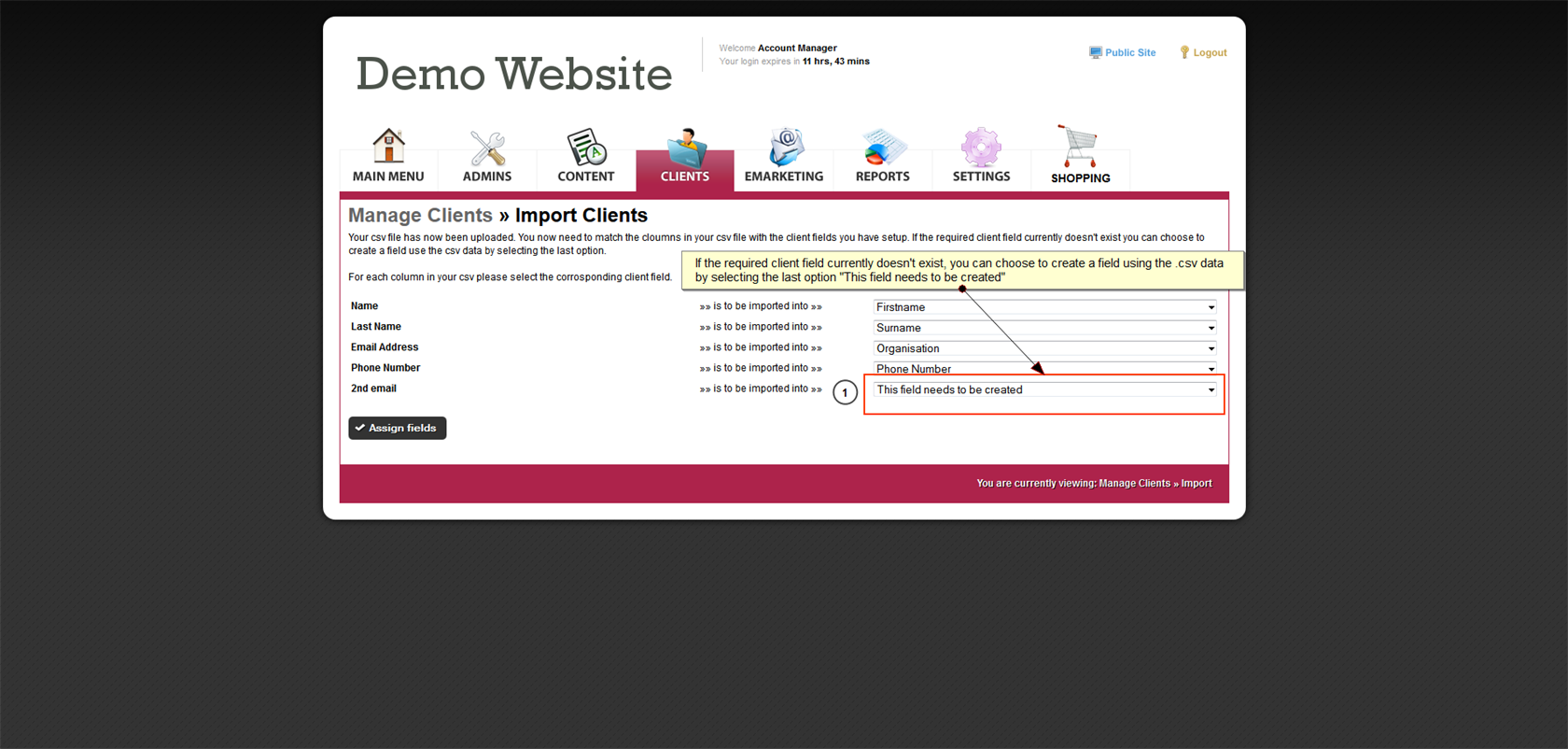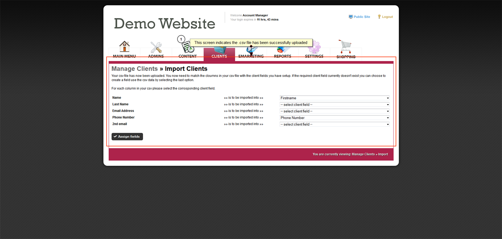 - Select the client fields from the drop down list on the right to match the cloumns in your .csv file (refer to screenshot)