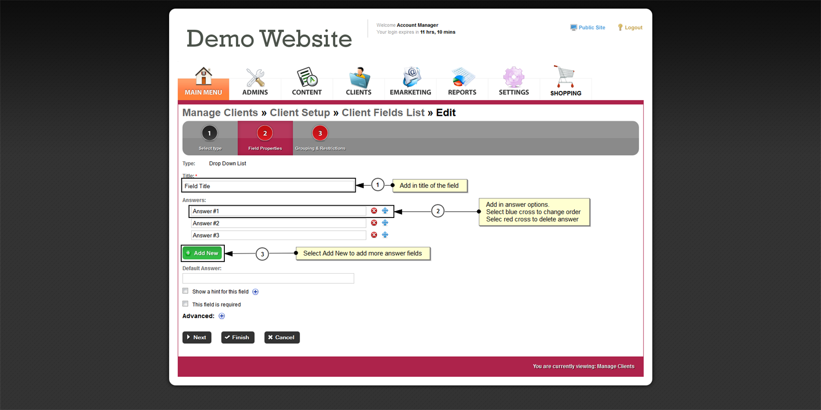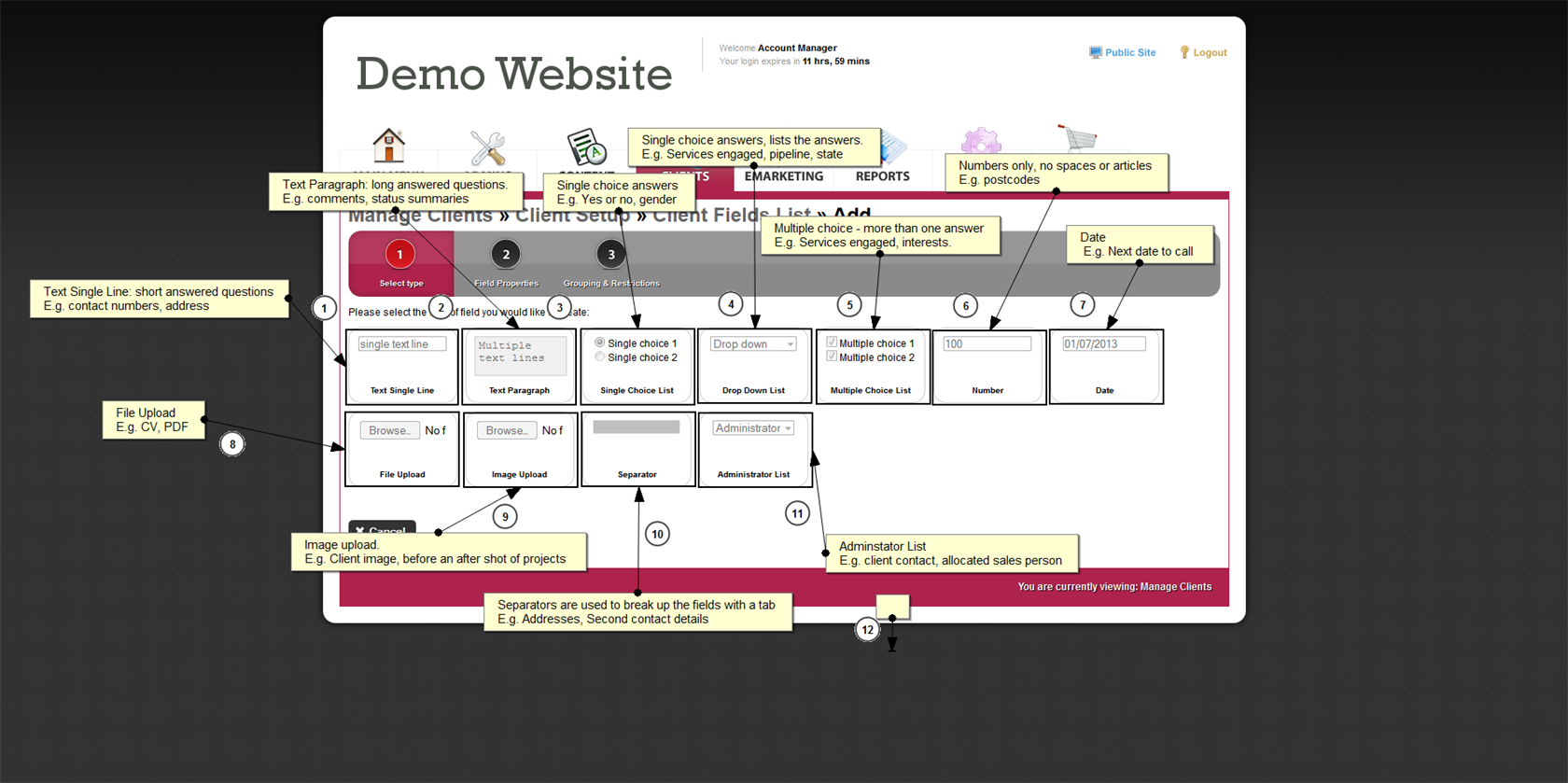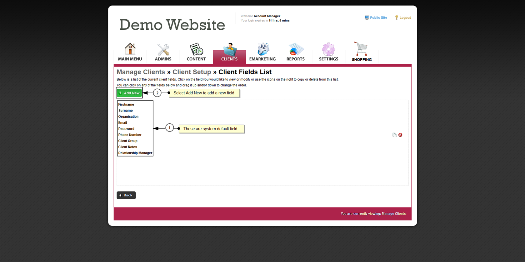Client Fields are the questions and answers that are used with the Client Record Management (CRM). It is a great tool to use to track the clients management within your organisation.