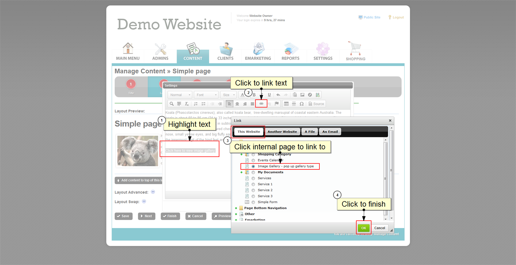 Your website provides you with easy to use functionality to create links within your website. Use this guide create internal links to pages within your website.