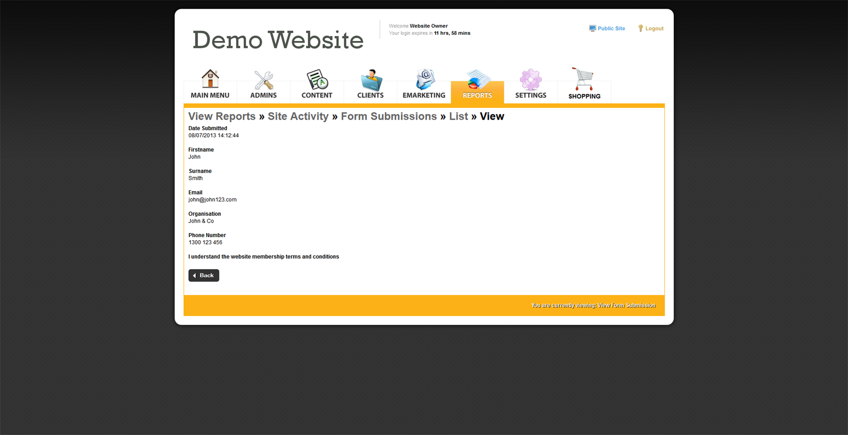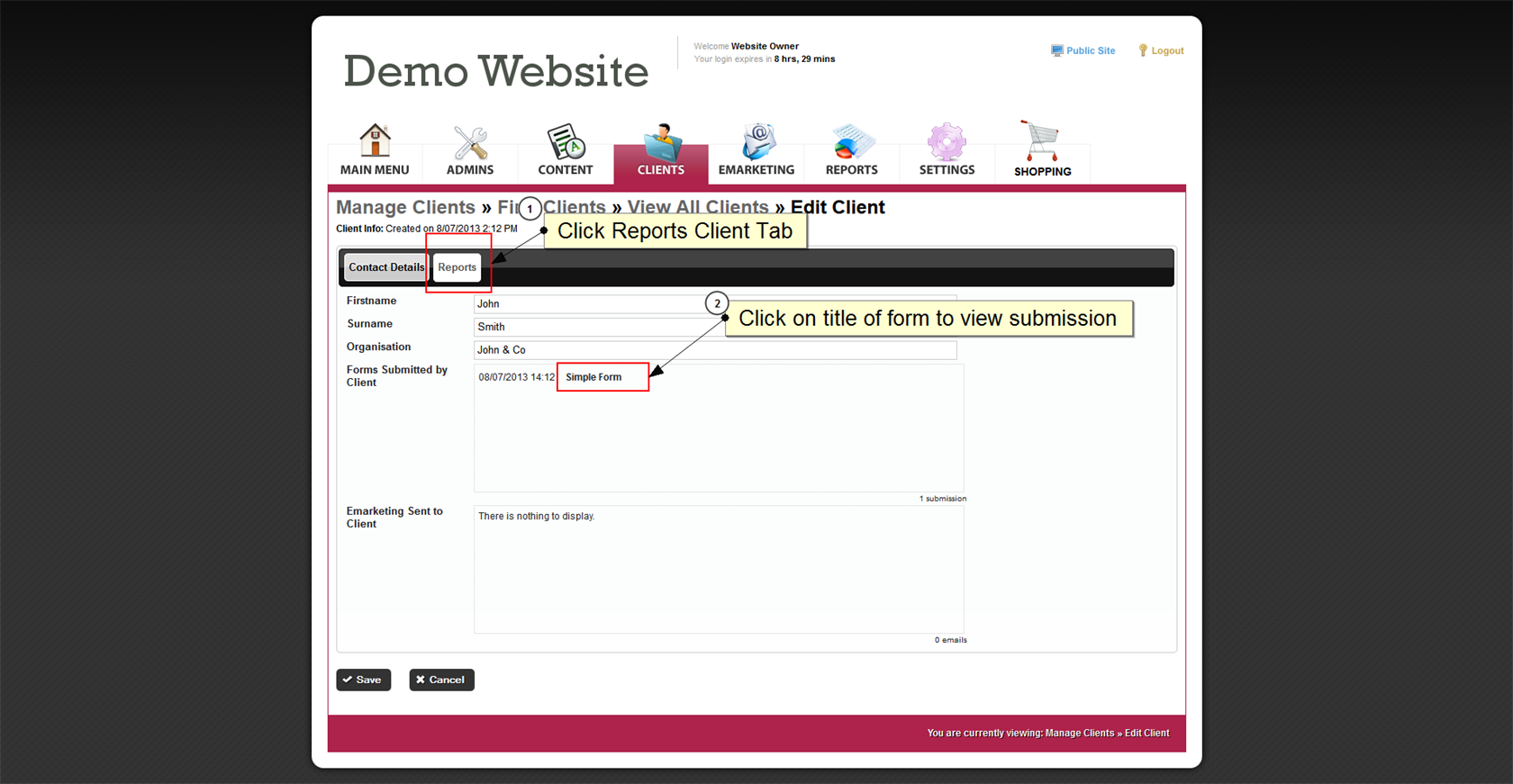 To view per client form submissions simply go the the clients section of your administrations site and Find a Client. Once in the Client Record go to the Reports tab and Select a submission under Forms Submitted by Client to view. Please note these will appear in here if the client is logged in when the form is submitted.
