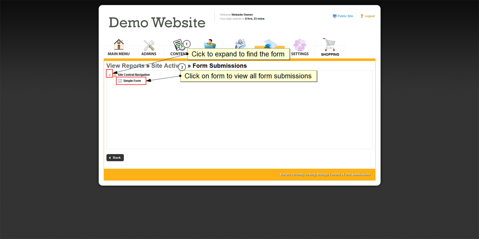 How do I view form submissions on the website?
