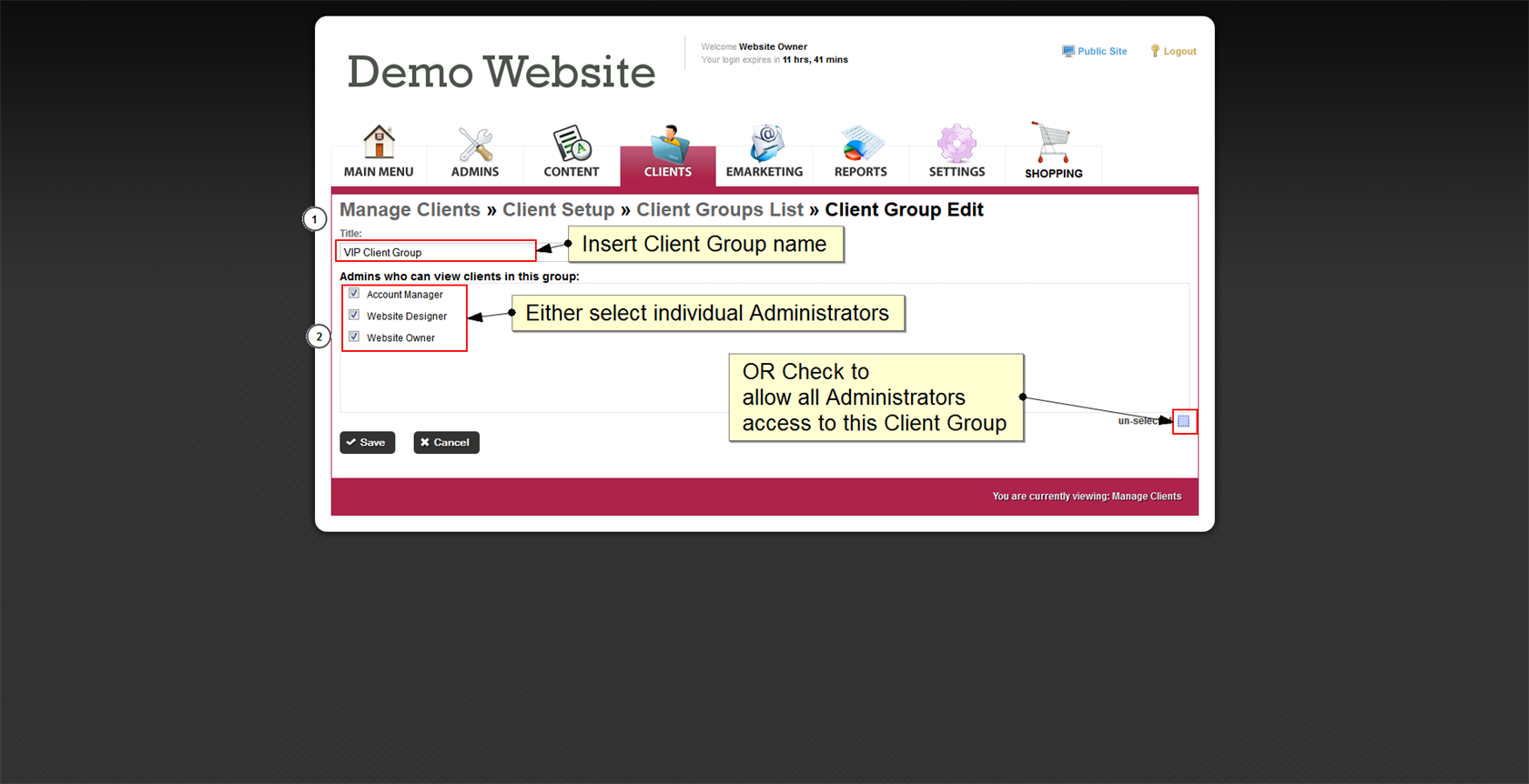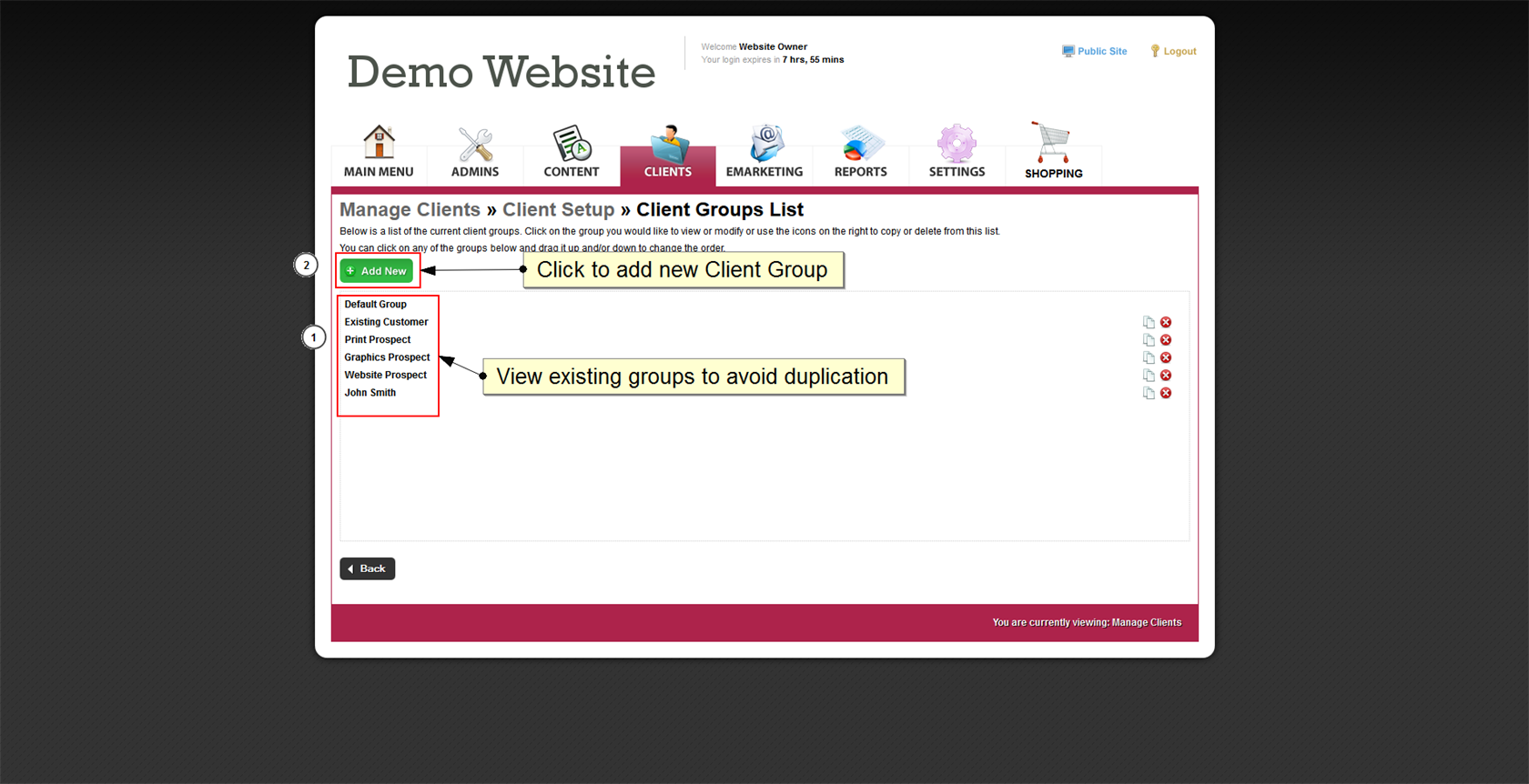 Your Client Groups can be used to identify groups, e.g. Existing Clients, Prospects, Members, Staff, Wholesalers, Retailers, VIPs, etc. These groups can also be used to nominate who sees restricted content in the front-end of the website. Different groups can be shown different restricted content. |