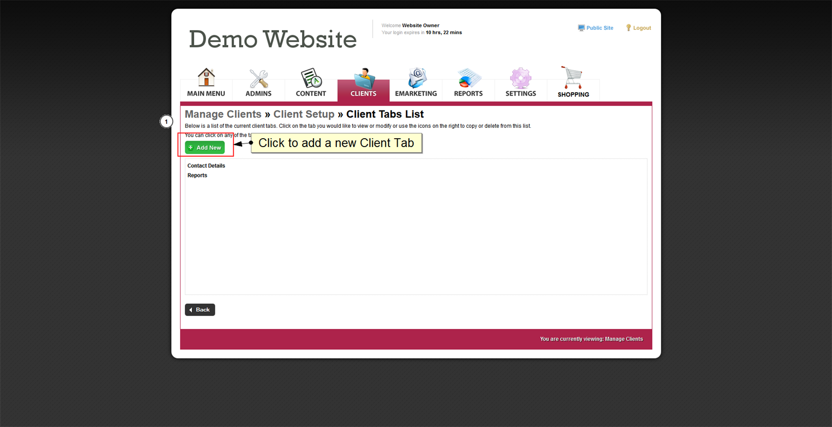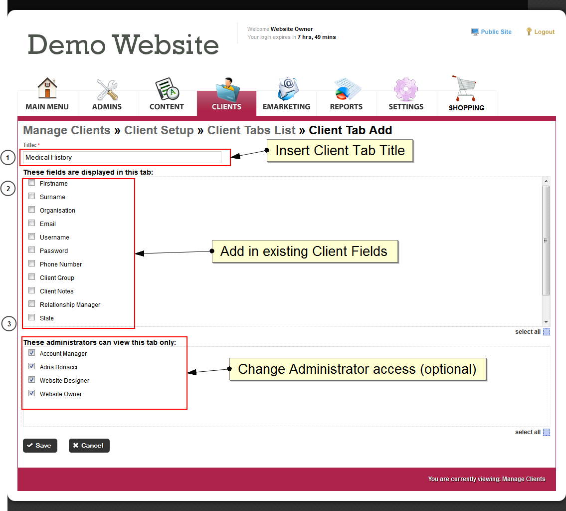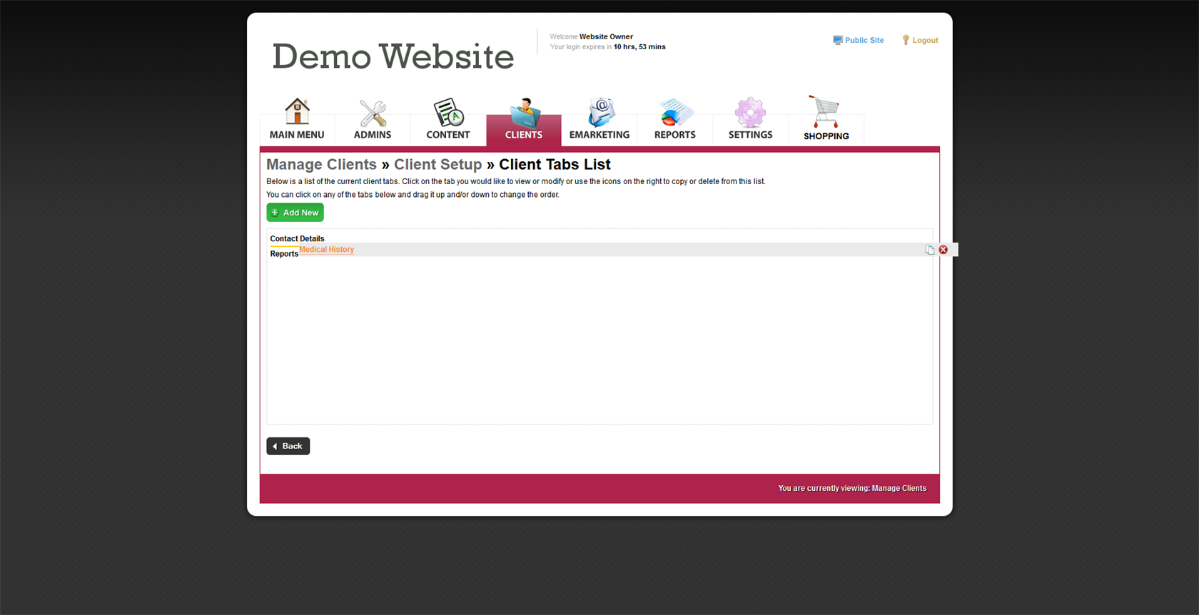 This guide will show you how to manage the Client Tabs area of your website Client Database. Client Tabs are a way to organise Client Fields into logical categories that apply to your business. Client Tabs apply to the Administration area only and does not impact the front-end of the website.