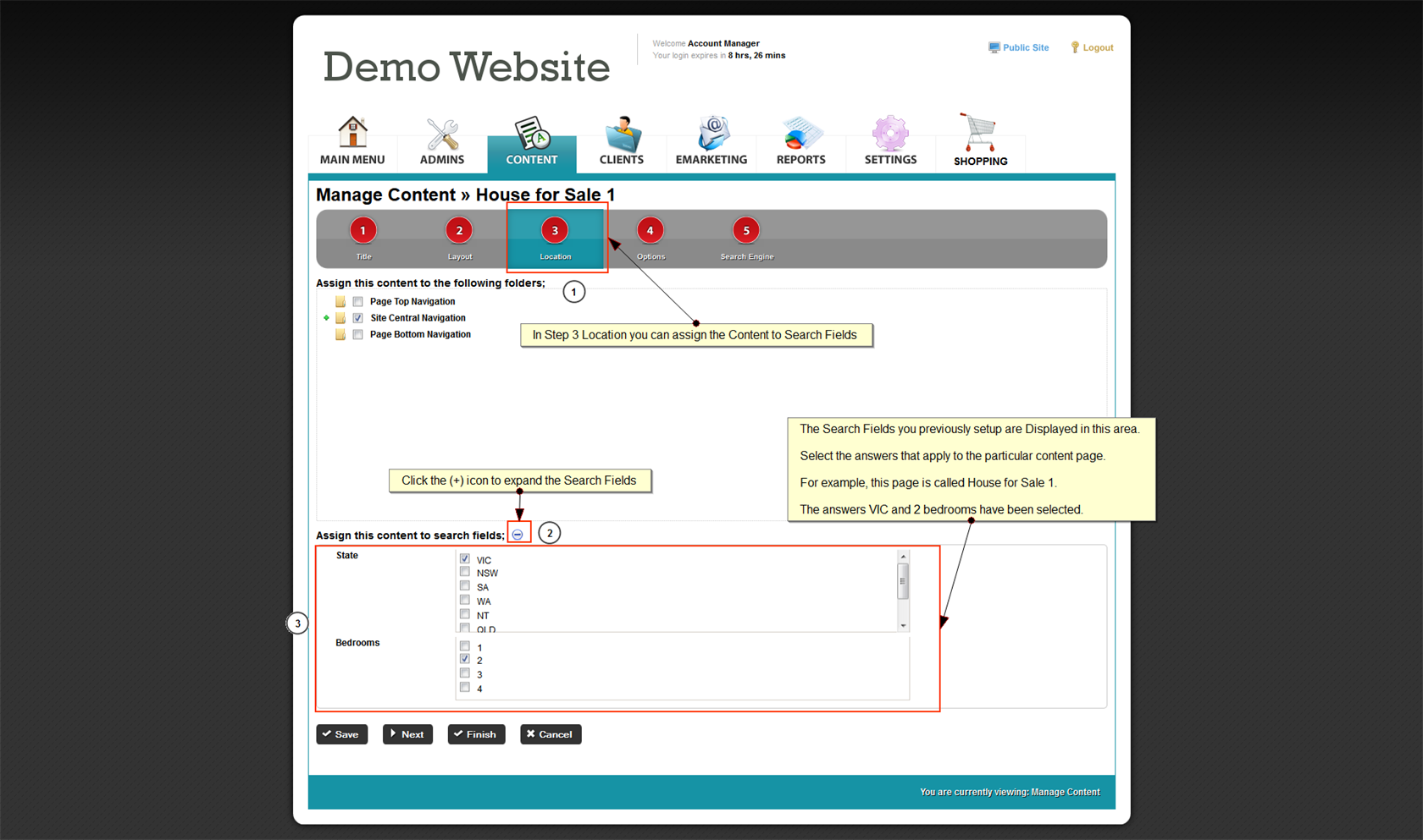 Enabling Content Search Features gives you the ability to edit Search Fields in Content Setup & the ability to assign content to search fields in the "Location" step when editing content.