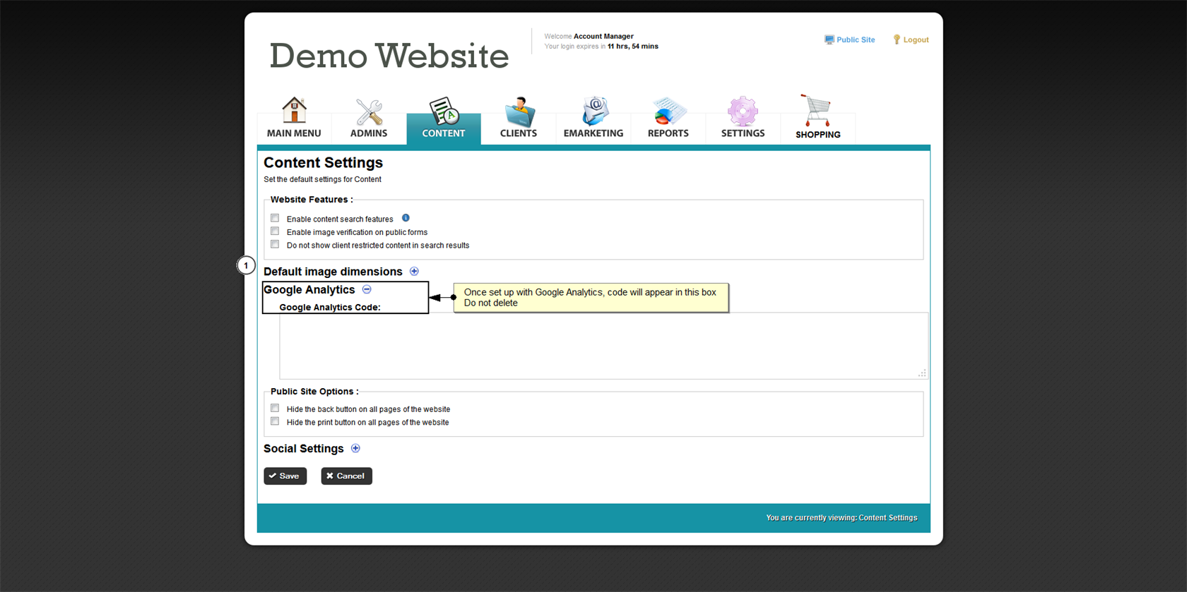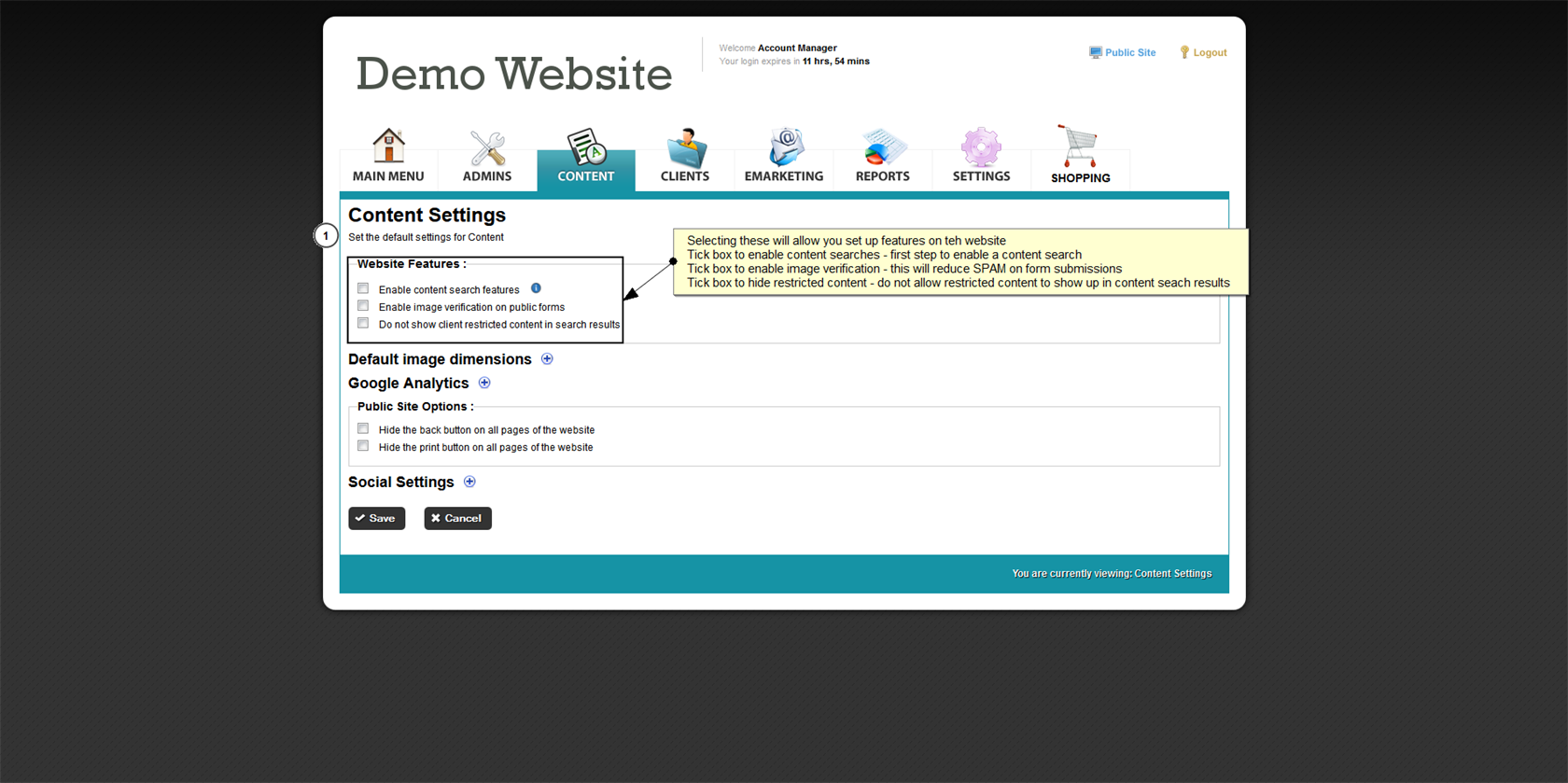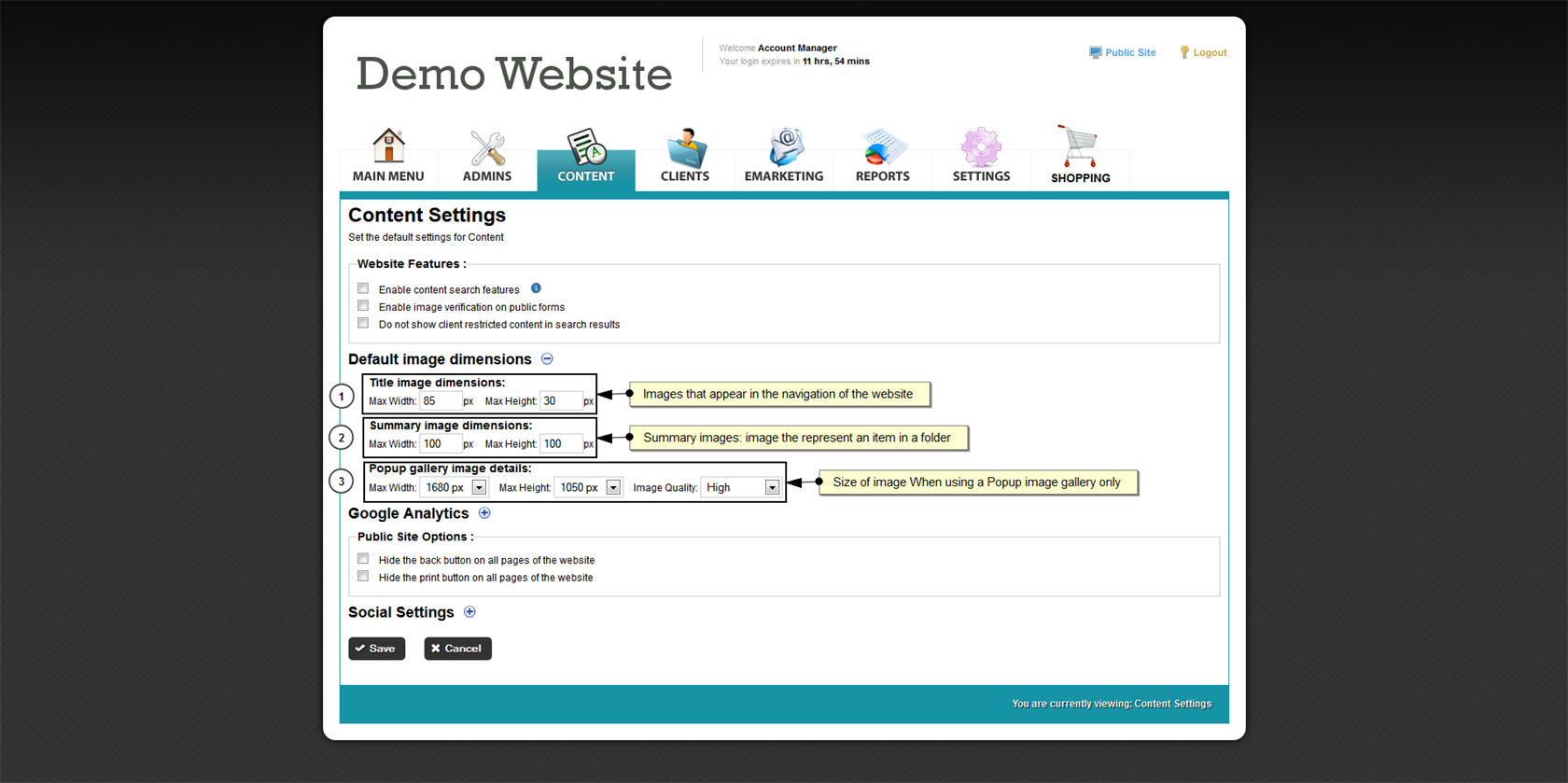The content area has default settings, within Content Settings you can edit these settings for your website.