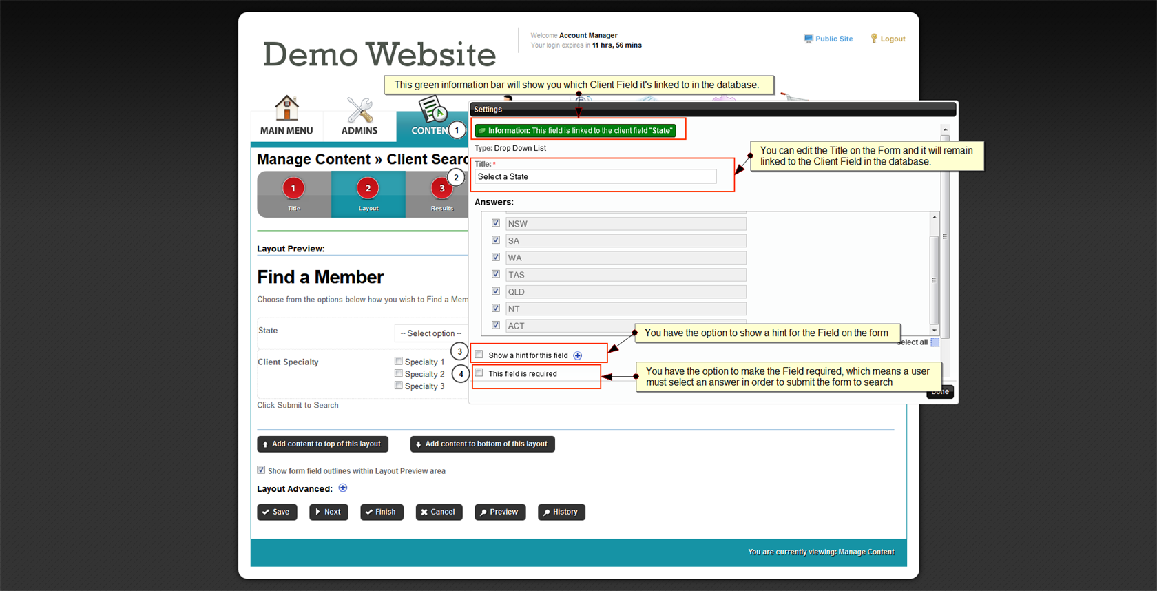E.g. On this page you may have a State Field, where a user could select the answer VIC to search for all Client's in your database who work in VIC.