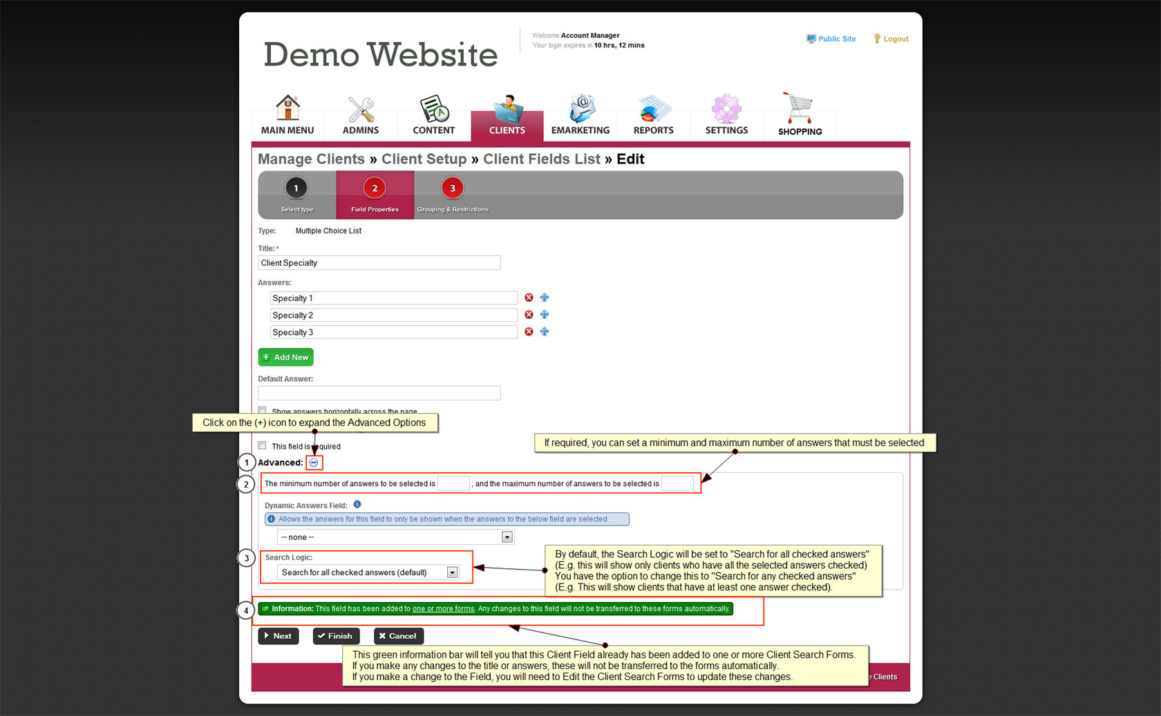 This guide will show you how to Edit the Search Logic for a Client Field. You are able to edit a client fields search logic to change the way the Client Search Results list works.