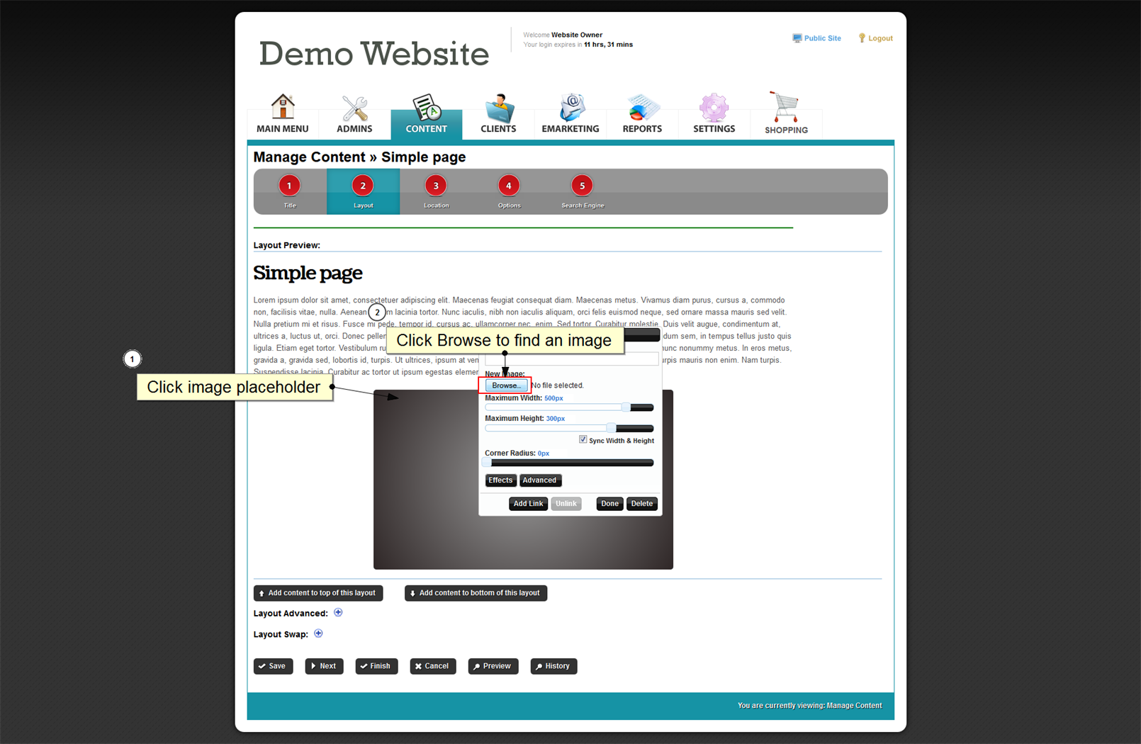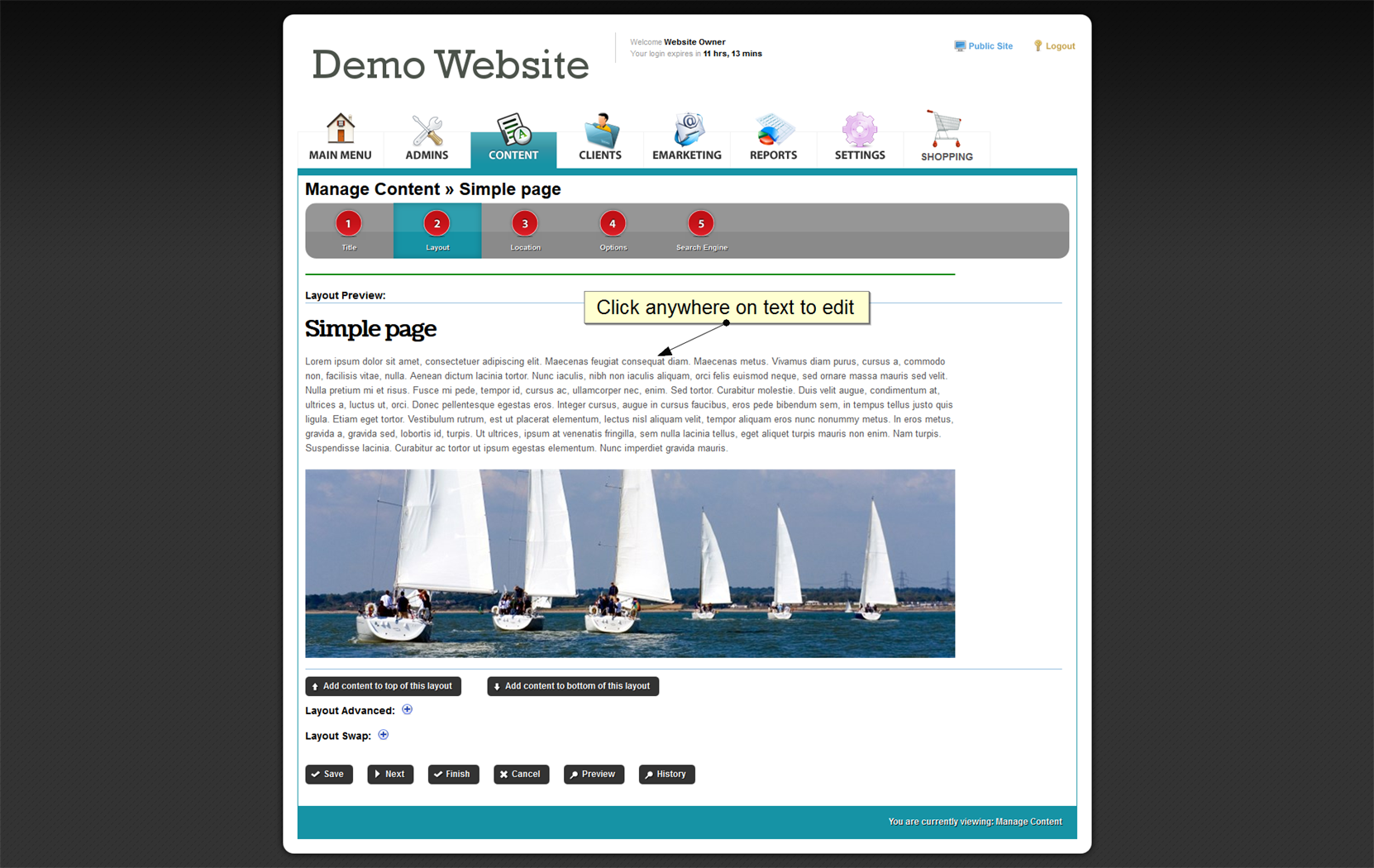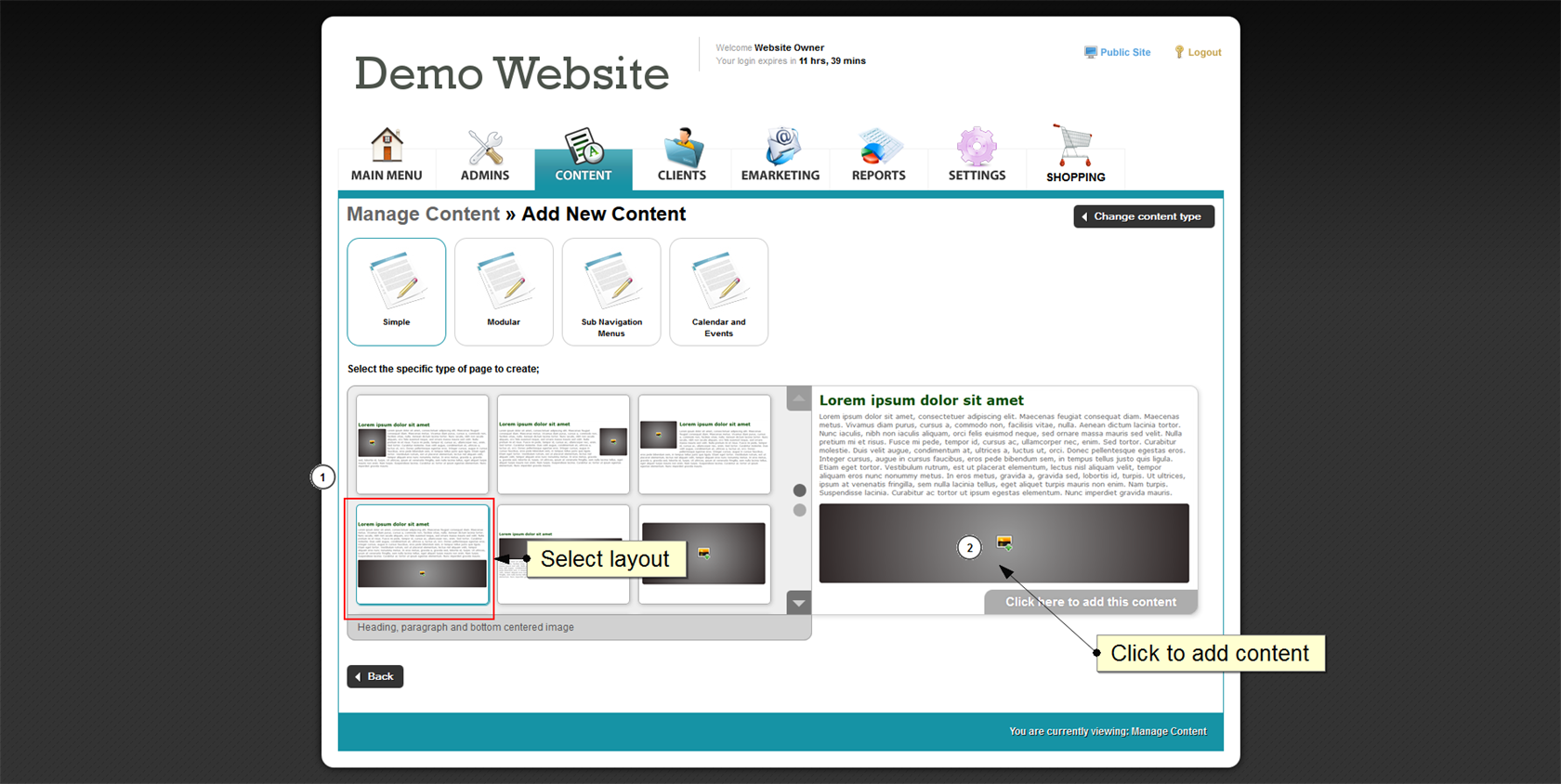 The simple layouts are typically used to display About Us or Useful links pages. They typically contain one image and room for one page of text. If your page is complex or has a lot of information it is recommended to select a more complex layout. |