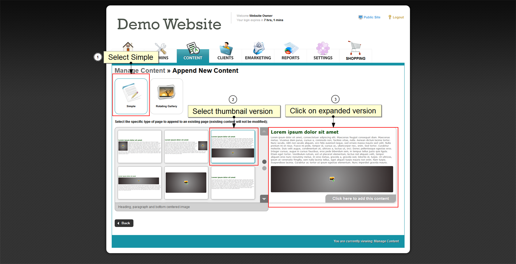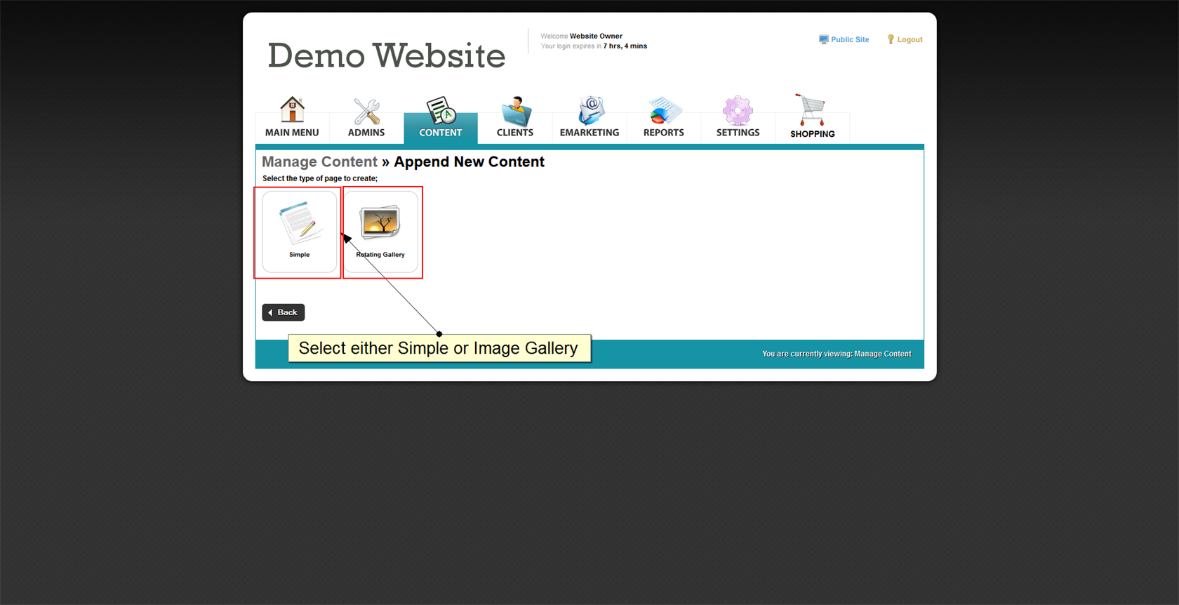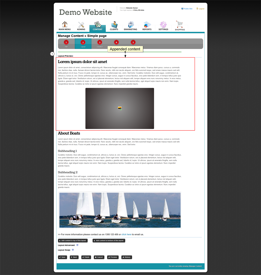 Appending content is great for creating more complex pages outside of the templates provided, or adding on more information or links above or below image galleries. This is a perfect way to create 'Next' and 'Previous' buttons at the bottom of an image gallery to link it to a different gallery. |